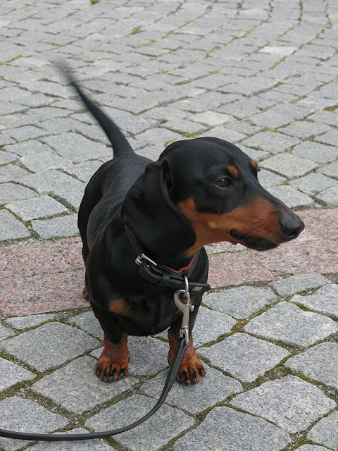 Olin kuvaamassa ruusuja Mauri-mäyräkoiran kodin nurkalla, kun MM oli nähnyt minut ikkunasta ja kävi herättämässä koiruuden päiväunilta moikkaamaan minua. -No, sehän johti tietysti siihen, että Maurin piti tulla moikkaamaan ulos asti, niin innoissaan tuo oli ... Eihän sitä nyt sovi herran kanssa keskustella "huutamalla" parvekkeelle 😁